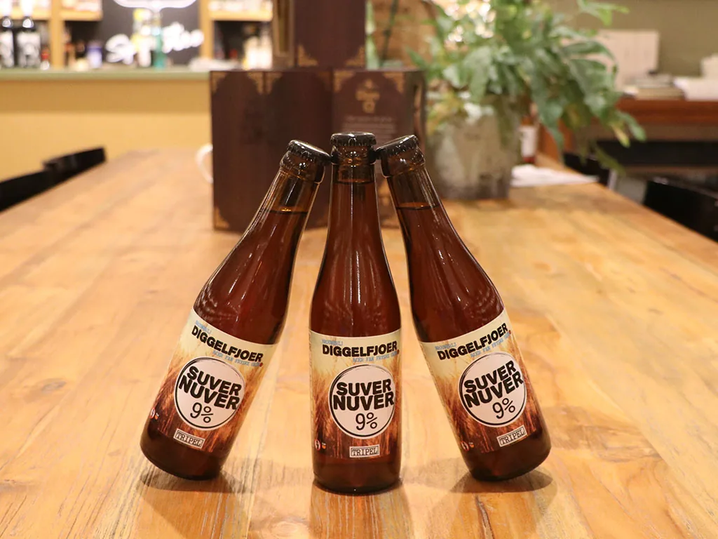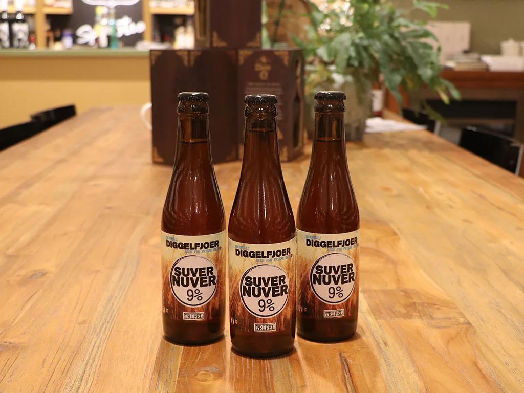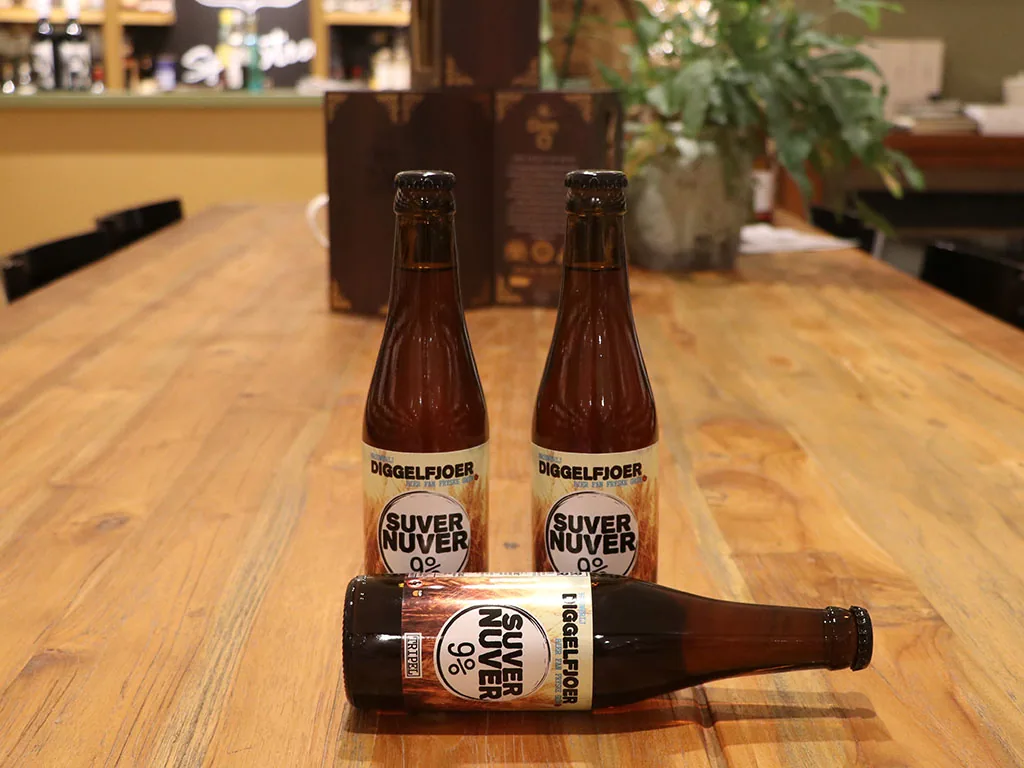 Het resultaat is een eigenwijze tripel van maar liefst 9% met een goudgele kleur, vol en kruidig van smaak. De flessen zijn voorzien van een fraai zelf ontworpen stickeretiket. De naam van het tripel is “Suver Nuver”, en is een vrije vertaling van “beetje vreemd” in het Fries.