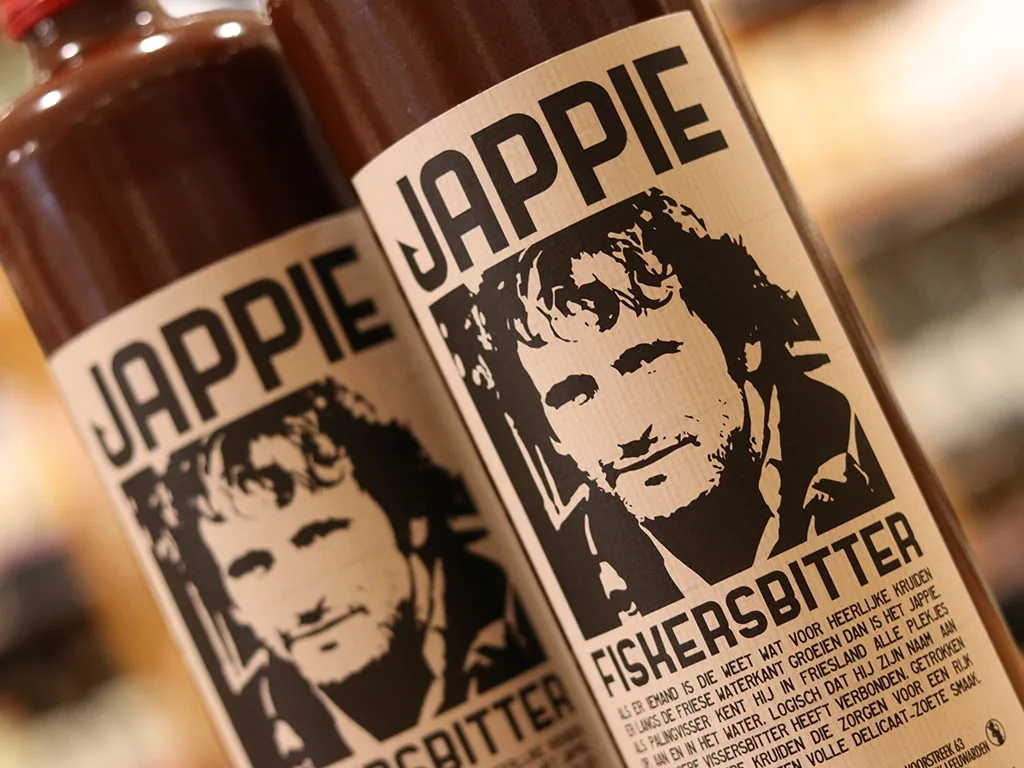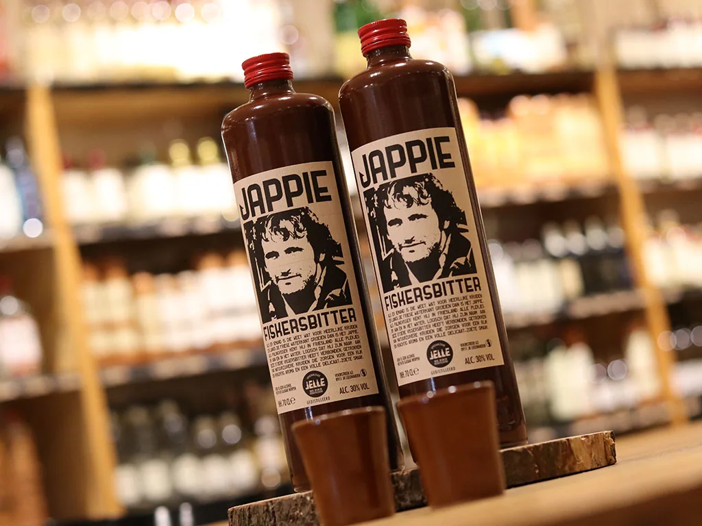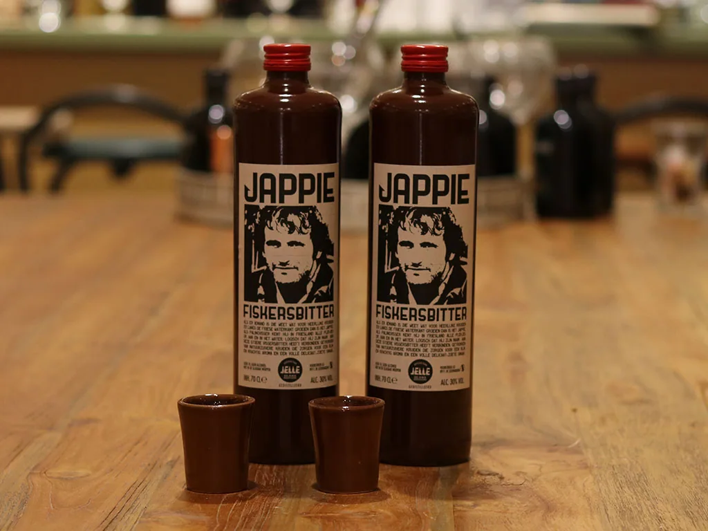 Jappie is een kruidenlikeur die je alleen bij Jelle kunt krijgen. Op het etiket zie je een oude foto van binnenvisser Jappie Spijkstra, de vader van Jelle. Het is gemaakt van allerlei kruiden en specerijen, waarvan er veel van langs de Friese waterkant groeien. De smaak is kruidig en zoet. Een echte allemansvriend die zowel gekoeld als op kamertemperatuur een echte aanrader is. Uiteraard staat Jappie altijd bij ons open op de proeftafel.